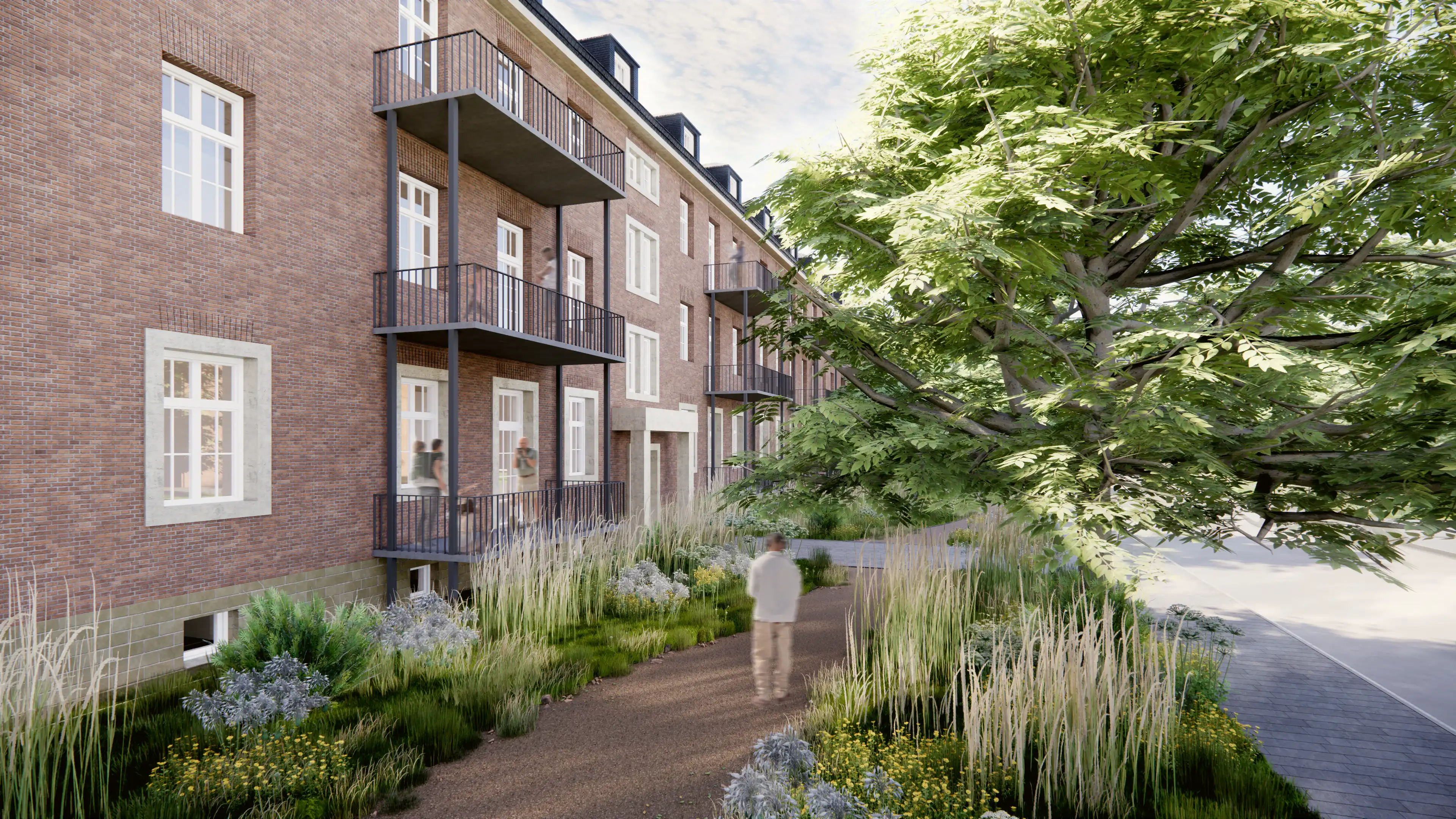 N° THREE befindet sich zwischen der Haupterschließungsstraße im Quartier und dem nördlichen Kreisverkehr gegenüber dem geplanten Nahversorger. Das Gebäude grenzt geschützt durch die alte Kasernenmauer an die Kempener Allee. N° THREE ist eines der prägenden Mannschaftsgebäude des Quartier Anglicus‘, das als Denkmal erhalten wird. Eingebettet in bedeutenden Altbaumbestand entstehen hier hochwertige Eigentumswohnungen unterschiedlicher Größen. Der Wohnungsmix wird zum neuen Zuhause für alle Lebenswirklichkeiten. In den Dachgeschossen entstehen auf zum Teil zwei Etagen Loftwohnungen mit Blick über das gesamte Quartier.