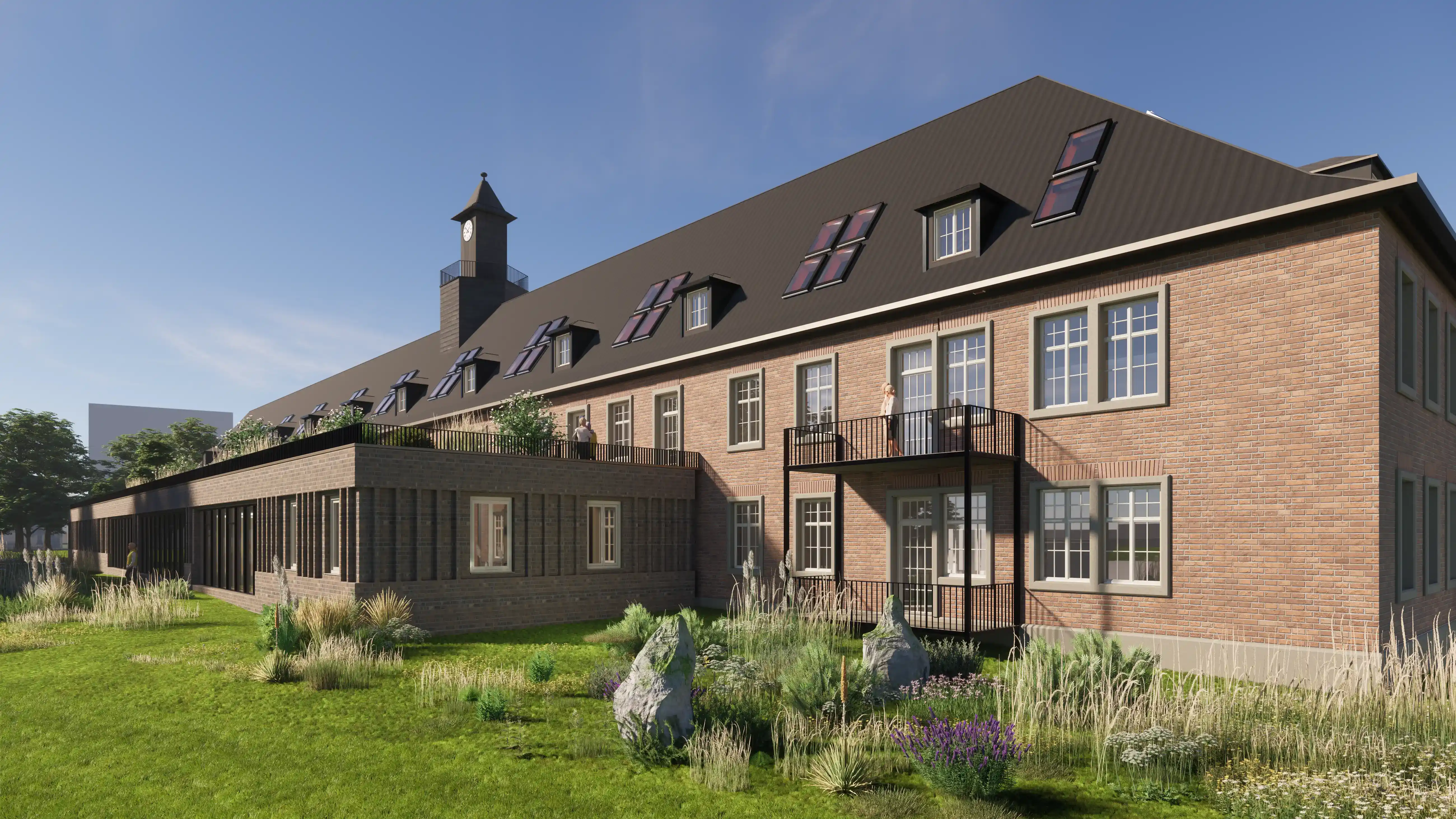 Die Flügel des Bauwerks rahmen eine prächtige Weide ein und vermitteln die historische Bedeutung des rund 13.000 m² großen Gebäudes. Die Nutzung der großzügigen Flächen sieht Senior Living im Zuge eines Betreiberkonzeptes vor, das den zukünftigen Bewohner:innen einen vielseitigen Service bietet. Die parkähnliche Struktur der Freiflächen, das Miteinander auf dem belebten Quartiersplatz sowie die fußläufige Erreichbarkeit der Waren des täglichen Bedarfs formen das Quartier zu einem lebenswerten Ort für Seniorinnen und Senioren.